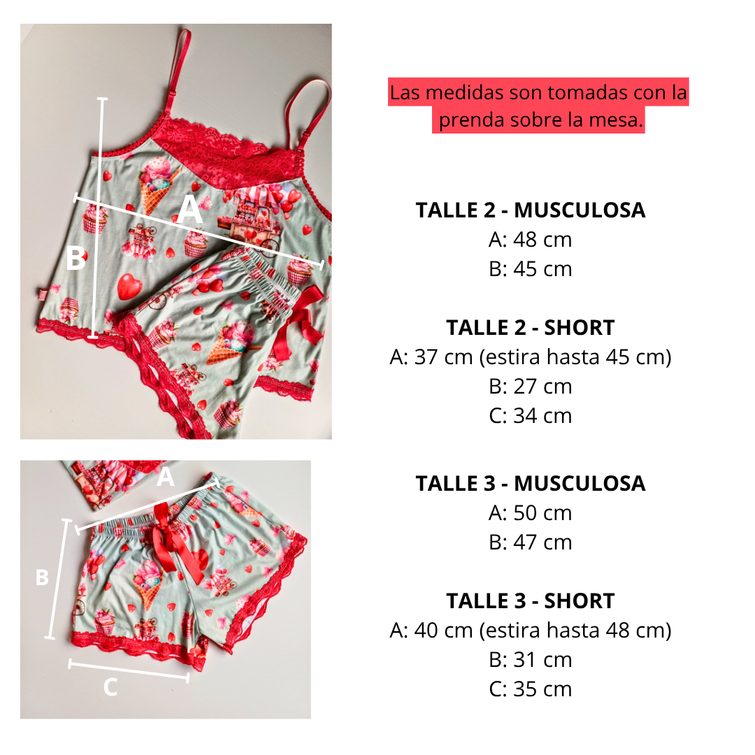 Pijama de musculosa con breteles regulables y short, confeccionado en algodón fino estampado, con detalles de puntilla roja.
